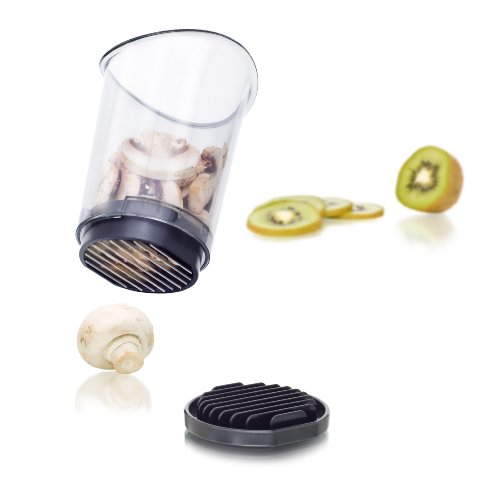 The slice and catch slices fruit and vegetables by pressing the cup with slicing blades down on top of the pieces and catching the slices in the container. Thin, uniform slices pop up into the container which is then used to pour the slices over your salad or other food preparations.